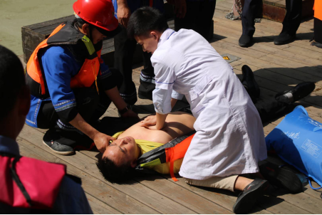 此次演练主要是模拟了乘坐游船过程中,突遇上游泄洪,导致水位上涨,流速加快,游船侧翻,两名游客落水。船岸安全员在第一时间发现事故后,立即上报码头现场负责人,由现场总指挥马上安排工作人员驾驶救援艇带领随行2名安全员展开救援行动。同时,现场总指挥按照边救援边报告的原则,在接到事故信息后立即按组织程序上报工作领导小组组长,启动应急救援预案,并联系医务人员到达现场准备施救工作。