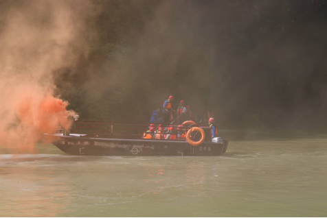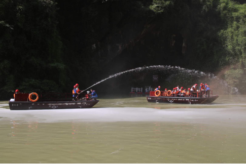 13日上午,参与演练的工作人员在蒲花暗河码头前列队集合,演练由指挥组、应急救援组、医疗救护组、后勤保障组、通讯联络组等组成。本次水上应急演练,主要以溺水事故、游船起火事故为案例,对现场警戒、抢险救援、伤员救治等工作进行实战演练,演练全程严肃认真,过程紧张有序,达到演练预期效果,取得了圆满成功。